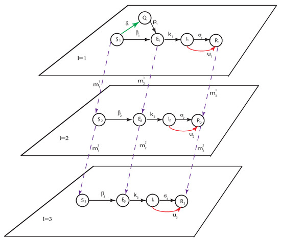 In contrast to classical SIRS models [43,44], where populations are divided into three groups, in this section, we formulate a three-level modified SEIR model (Susceptible-Infected-Recovered-Susceptible) with one virus circulated in a population of size N. This auxiliary partitioning allows us to capture three epidemic processes that occur in different population clusters. Individual regions, villages, cities within a country, and different countries can be considered clusters. According to this assumption, we can say that if the epidemic has been initiated in the small village (first cluster), then it might be extended to the city and region or country. Formally, this epidemic situation can be formulated as the framework. The virus propagation starts at the first level of hierarchy and continues on the i-th levels, according to the migration rates. We consider this spreading process as the first level hierarchy in the susceptible-quarantined-exposed-infected-recovered-susceptible (SQEIR) model. At the first level, we consider five subgroups: susceptible , quarantined , exposed , infected , and recovered. We suppose that susceptible people are subject to the threat of the virus because recovered people are assumed to have developed immunity, and quarantined people are those who are isolated and therefore cannot be in touch with other people who are potentially infected (in the following, the susceptible proportion of people will be our control variable on the first level). The pathogen infects the exposed and the infected groups, and their contact with other people may infect the susceptible group, but neither the recovered nor the quarantined people. It is also assumed that a subgroup of the exposed group represents residents of the population who do not develop the disease symptoms. The division of the entire population differs from the first cluster in the second and the third clusters, where we have the following subgroups susceptible , exposed , infected , and recovered . In all clusters, members of the susceptible group become members of the exposed group at the rate of , ; exposed people develop symptoms and become infected people at the rate , . For all clusters the self-recovery rates are defined as , . The parameter shows the rate at which susceptible people choose isolation and become quarantined. At the rate , residents from the quarantine group return to the susceptible group. Moreover, it is supposed that migration occurs between clusters and that migration rates are , , and , respectively. In the course of time, the protection level of recovered residents vanishes at the rate of , . The scheme of the transition is represented in Figure 2.