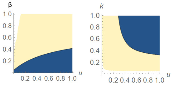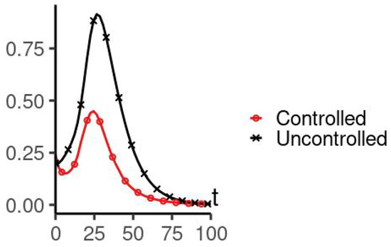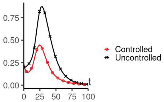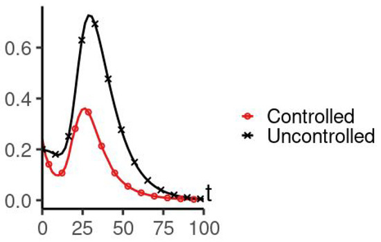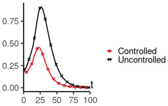 According to the left diagram in the Figure 3, if the control is 1 for the given example, then the parameter will cause epidemics to spread with , but if , which is rather small, then there is always a control that eliminates epidemics. The figure also confirms the intuitive reasoning that the larger the , the more effort is required to stop epidemics.