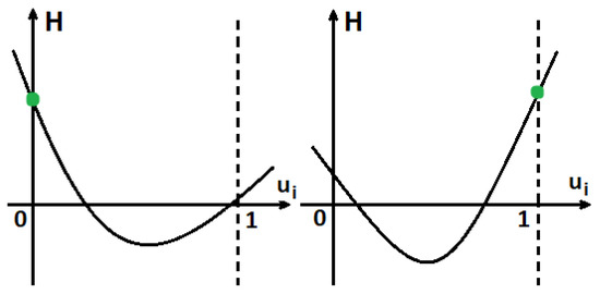 Let be a concave function (); then, according to (5)–(7) the Hamiltonian is a convex function of . There are two different options for that maximimize the Hamiltonian. Parameter .