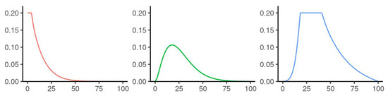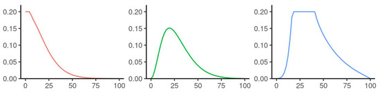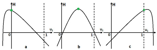 where , , and . There are three different types of points at which the Hamiltonian reaches its maximum (Figure 5). To find them, we need to consider the derivatives of the Hamiltonian at and . If the derivatives (24) at are non-increasing (), then the value of the control that maximizes the Hamiltonian is less than 0, and according to our restrictions () the optimal control will be equal to 0 (Figure 5a). If the derivatives at are increasing (), this means that the value of the control that maximizes the Hamiltonian is greater than . Hence, the optimal control will be 1 (Figure 5c); otherwise, we can find the value of (see Figure 5b):