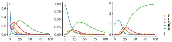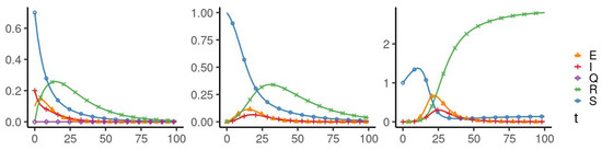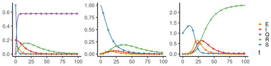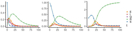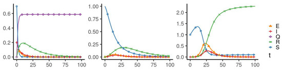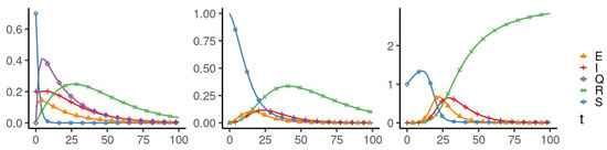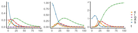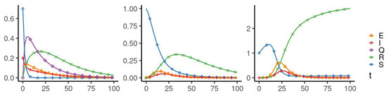 Experiment 1. In the current experiment, we present the SQEIR model under the assumption that quarantine is not possible for susceptible people. Applying the specially designed procedure and considering the cluster structure of the population, we obtain the result that the epidemic starts and reaches its maximum faster at the first stage than at stages . At the second and the third clusters, the epidemic starts with delays; Figure 6 demonstrates this fact.
