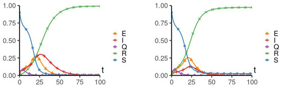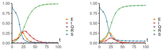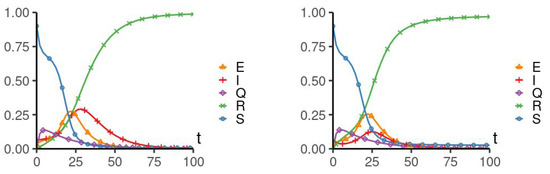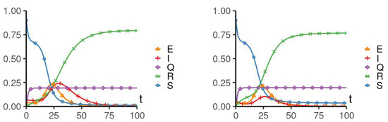 Experiment 2. In the current experiment, we consider the SQEIR model with quarantine (, ). We assume that the government has imposed quarantine measures and that citizens should stay at home. This experiment shows the effects of quarantine measures on the development of an epidemic situation. The behavior of the system in the uncontrolled and controlled cases is shown in Figure 11 and Figure 12.