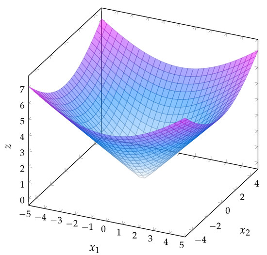 where and . is the norm of the vector x. Figure 2 shows a second order cone in , clearly a convex set. For further details about the optimization convex, see [33].