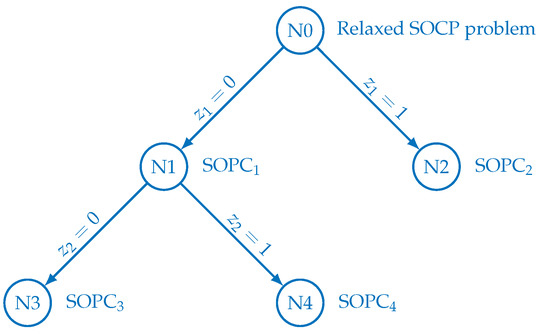 To address the optimal solution of the problem of the optimal location and sizing of capacitor banks in power distribution networks, the classical B&B method is combined with the SOCP relaxation of the power flow problem as depicted in Figure 3. Note that an MI-SOCP problem has the following general structure: