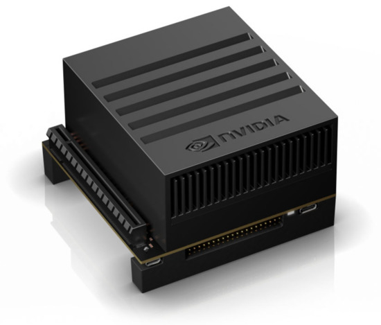 The entire object detection and tracking stack that is described ran on a Jetson AGX Xavier module (see Figure 2). This embedded processing unit is lightweight and has low energy requirements. It compresses the video using dedicated hardware and performs all necessary computation. The complete technical specifications of the module are presented in Table 1. The unit, due to its small size and power requirements, is limited in terms of processing power (CPU, GPU). The aim was for the computing module to be carried by the UAV and be directly connected to its camera feed, making the system completely autonomous, hence the use of a lightweight, low-power unit. The main aim of the test described was to select the optimal architecture and training set within our restrictions. This module was used in all the comparative tests described below.