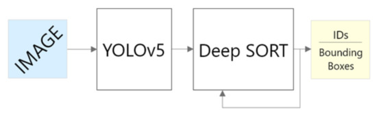 The general architecture showing the distinct components of the system. An image is fed to YOLOv5, and detections are passed to the DeepSORT tracking algorithm. IDs and bounding boxes are retained as the object is tracked.