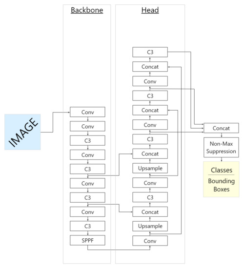 The head was also created from convolutional layers and C3 modules, while using features from different stages of the backbone. Other residual connections end up at the last detection layer, mixing up information from different scales, enabling the network to more easily detect objects of various sizes. The final bounding boxes and their corresponding classes are computed by the non-maximum suppression (NMS), a post-processing algorithm responsible for merging all detections that belong to the same object [17].