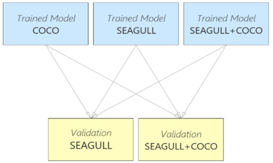 The reason for combining a general-use object detection dataset (COCO) with a domain-specific dataset (SEAGULL) was to improve the performance of the deployed model. SEAGULL contains a narrow spectrum of bounding box sizes. On the other hand, COCO solves this problem by providing the whole range of bounding box sizes, from the tiniest to one covering the whole image. In addition, the COCO dataset contains images with “sky objects” such as birds.
