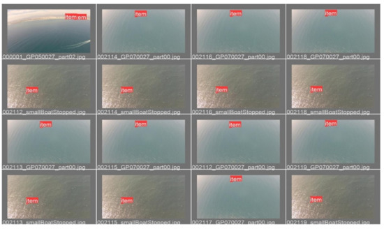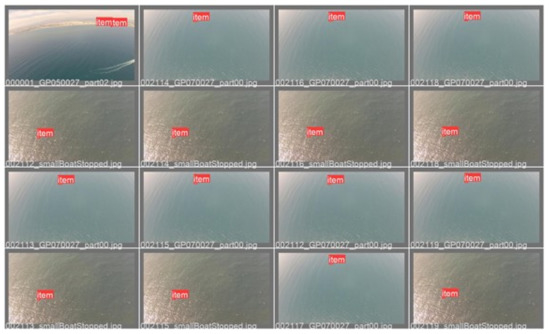Some examples of the frames extracted from videos of SEAGULL are shown in Figure 11 and Figure 12. Both groups of frames display the same frames. Figure 11 shows the ground truth bounding boxes that SEAGULL provides and Figure 12 the predicted bounding boxes by the trained algorithm with the corresponding confidence. These figures present difficulties, such as boats at long distances and very small objects floating on sun glares. In calm waters, the very small objects were detected, which demonstrates the success of the model. The other cases, where the objects were not detected, were predictable because of two main reasons. The first was the low resolution of the input image and the second the very small objects that reside in areas of the frame where the object was not distinguishable from the sun glares, waves, or surrounding environment.