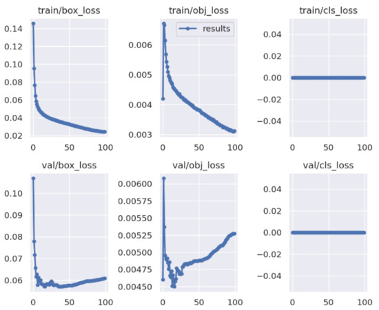 The progress of training during the 100 epochs is shown in Figure 13 and Figure 14. In Figure 13, in the training losses (first row), class loss was zero since we did not apply object classification. The progress of objectness loss showed that the model detected objects from the start of training, reached a peak for the first epochs, and converged at the 100th epoch. The box loss progression implies that as more epochs passed, the model performed well on the training dataset. In the validation losses (second row), class loss was zero as well. In contrast with the training objectness loss, the validation objectness loss fell very quickly during the first few epochs. However, there was no significant improvement during the next epochs. On the other hand, the more epochs the model was trained for, the worse it performed on the SEAGULL validation dataset. The same applied for the validation box loss.