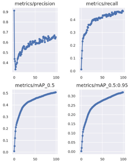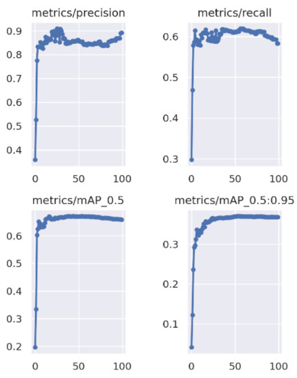 In Figure 14, during the first 15 epochs, all metrics converged on a constant value. What can be derived from the precision and recall graphs is that false positive and false negative detections did not decrease and oscillated around 0.85 and 0.6, respectively, after the 15th epoch. Furthermore, the mean average precisions implied the same conclusion, as well as that the overall performance did not improve.