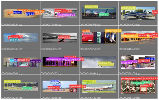 Some examples of the images included in COCO are displayed in Figure 15 and Figure 16. Both figures display the same group of samples. Figure 15 shows the ground truth bounding boxes with corresponding classes of the objects, and Figure 16 shows the predicted bounding boxes with their classes and the level of confidence. Almost all objects were detected within an image, despite their compact density and the complexity of the image, with minor false negatives and false positives. The confidence of detection was higher when objects were not occluded and distinct.