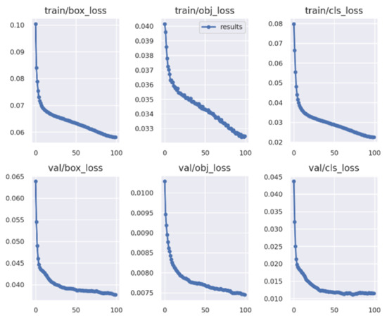 The progress during the 100 epochs of training is shown in Figure 17 and Figure 18. In Figure 17, in the training losses (first row), class loss decreased more as more epochs passed and converged at 0.021. The progress of objectness loss decreased and showed potential for even further reduction beyond the 100th epoch training. The same applied for the box loss. In the validation losses (second row), class loss stabilized around 0.012 after 50 epochs. Objectness loss showed potential for further reduction if we trained the model even more. This was in contrast to the first experiment. From this metric alone, it can be concluded that the model’s performance in accuracy can be improved even more. The same applied for the box loss. Neither converged on a value after 100 epochs and had a descending trajectory.