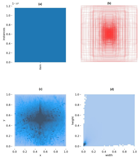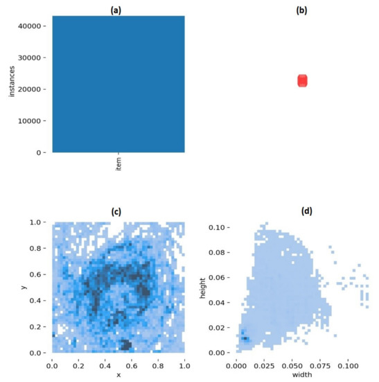 Comparing the two models, in Figure 19 and Figure 20, Graphs (a) represent the number of training items in the dataset, Graphs (b) the anchor boxes used for the final bounding boxes, i.e., the detections, Graphs (c) the frequency of the central positions of the objects of the dataset, and Graph (d) the size of the bounding boxes as a percentage of the images’ width and height for the SEAGULL- and SEAGULL+COCO-trained models, respectively.