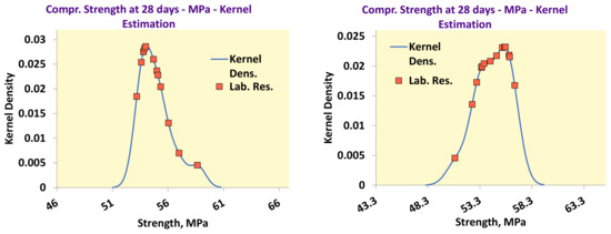 ISO 13258-2015 [14] (p. 10, Note 1) refers that a kernel density plot is functional in identifying bimodalities or lack of symmetry. This standard describes the algorithm to develop these plots in paragraph 10.3 [14] (pp. 32–33), and Figure 1 shows two examples of kernels plots of two 28-day strength tests performed during 2020. The software utilizes normal distributions and the nIQR as the standard deviation estimator to derive the kernels, as the standard recommends [14] (p. 32).