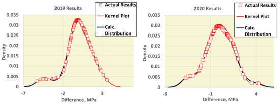 The results of each test belong to distributions that are difficult to disclose for participating laboratories, 11 to 13 per round. However, the results of all yearly tests are a population large enough to estimate the distribution. The algorithm achieves normalization by using the difference of the assigned value from the mean value of each participant, Dij = xij − xpt,j, where i is the participant and j is the round. Figure 2 depicts the kernel functions and the actual 28-day strength results for the 2019 and 2020 rounds.