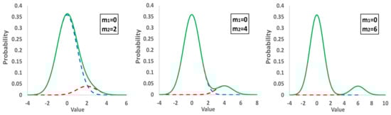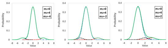 - The mean values m2 and m3 differ by an integer number of standard deviations s1 from m1, n2 and n3, shown in Equation (10). In the case of trimodal distribution, if n2·n3 > 0, then D2 and D3 are both to the same side of the D1. Otherwise, one is to the left and the other to the right of D1. Figure 4 of Section 2.1 depicts such distributions: