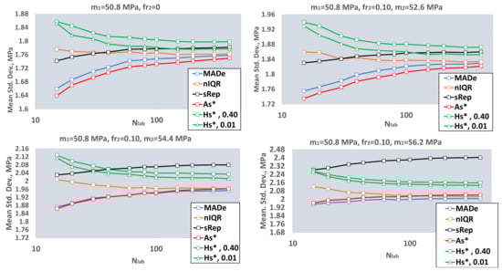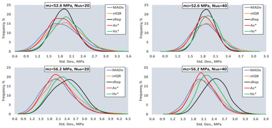 Figure 7 depicts the distributions of the population standard deviations for one simulation with Niter = 10000, Ns = 1, sr = 0.01, m2 = 52.6 MPa, 56.2 MPa, fr2 = 0.10, Nb = 20, and Nlab = 20, 40, from where one can observe: