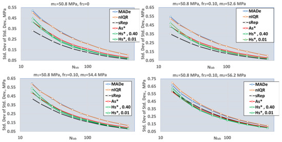 Standard deviations of the population standard deviations. MADe: scaled median absolute deviation; nIQR: normalized interquartile range; sRep: reproducibility standard deviation without outliers; As*: standard deviation—Algorithm A; Hs*, 0.40: standard deviation using Q method and sr = 0.40; Hs*, 0.01: standard deviation using Q method and sr = 0.01.