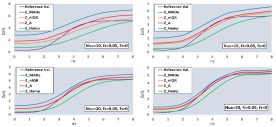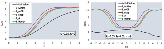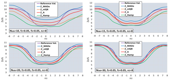 One can observe that the optimal estimator is a function of both the number of deviations and the number of labs. In bimodal distribution and for the given f2, Z_Hamp is optimal for n2 ≤ 2 and n2 ≥ 6, depending on the Nlab value. Z_MADe is more efficient for Nlab ≥ 20 and n2 = 4, while for the other values of n2 and Nlab, the optimal estimators are Z_nIQR and Z_A. The trimodal distributions of Figure 10 contain two bimodal distributions in the case n3 = 0 and 8. For the given value of n2, Z_Hamp is more efficient in the center for −2 ≤ n3 ≤ 2. Z_A and Z_nIQR are optimal in the two side zones for n3 ≤ −6 and n3 ≥ 7 and n3 = −3, n3 = 3. Finally, Z_MAde is the closest estimator to the reference values in the two intermediate zones for −5 ≤ n3 ≤ −4 and 4 ≤ n3 ≤ 6. The conclusion from the processing so far is that there is no generally optimal robust estimator, but its choice depends on the type of population distribution and its variance.