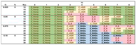 Figure 11 shows the optimal robust estimators of Zu% for the bimodal distributions and the settings of Table 4. For f2 = 0.025, the Q/Hampel estimator is predominant for most of the n2 values, and only for n2 = 4 method A and MED-nIQR are optimal. By increasing f2, Q/Hampel remains optimal for n2 ≤ 2, and its performance gradually decreases to high values of n2. For f2 = 0.05, method A and MED-nIQR predominate for 3 ≤ n2 ≤ 6. As f2 increases, MED-MADe becomes optimal near the mid-range of n2, while the optimal Z_A move to the right, replacing Z_nIQR and Z_Hamp.
