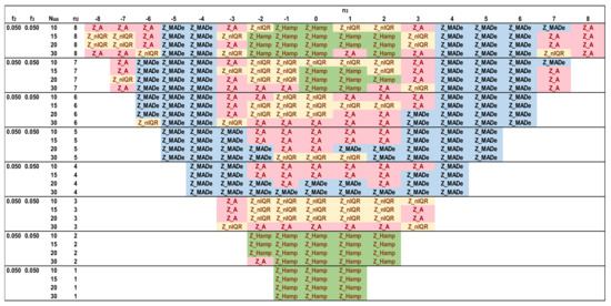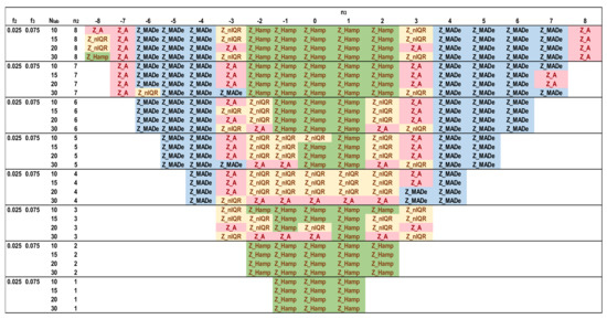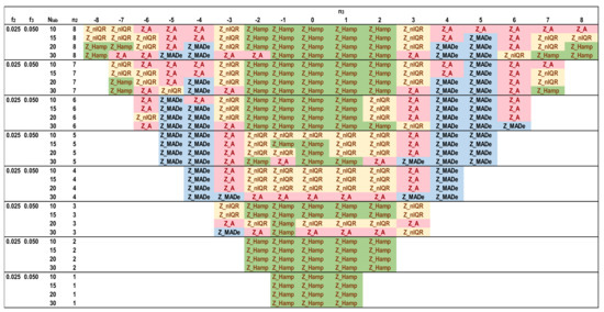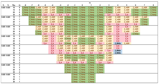 Figure 12, Figure 13, Figure 14 and Figure 15 depict the optimal estimators of Zu% for the trimodal distributions and all the combinations of f2 and f3 with f2 + f3 ≤ 0.10. For f2 + f3 = 0.05, Q/Hampel is optimal in the center (−3 ≤ n3 ≤ 3) and in the two sides (n3 ≤ −6, n3 ≥ 6) for low and high n2 values. Method A and MED-nIQR are highly performing in the remaining area of n2, n3. These results agree with those of Figure 11. For f2 + f3 = 0.075, Q/Hampel is optimal mainly in the center (−2 ≤ n3 ≤ 2) for low and high n2 values. MED-MADe shows the higher performance for the two mid-ranges of n3 (n3 = −4, −5, and n3 = 4, 5) while method A and MED-nIQR remain optimal in the remaining area. For f2 + f3 = 0.10, the area covered by optimal Z_MADe is larger, replacing Z_A and Z_nIQR. Especially for f2 = 0.05 and f3 = 0.05, the region of optimal Z_Hamp becomes narrower, replaced mainly by Z_nIQR. Figure 11, Figure 12, Figure 13, Figure 14 and Figure 15 are suitable for practical reasons because they allow the PT scheme expert to select the proper robust estimator to evaluate the unsatisfactory results when the number of participants is between 10 and 30 with the underlying assumption that the main distribution presents a coefficient of variation ~2. Rounding to the values given in these figures is necessary for the number of labs and the f2 and f3 fractions calculated from the actual distribution.