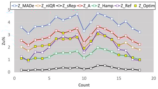 Figure 8 proves that the calculation of Zu% using Z_sRep results leads to a severe underestimation of the percentage of the unacceptable Z-factors, compared to all the other estimators. The Zu% values derived from the robust estimators are close to each other and not far from the initial values computed using the main normal distribution. The Zu% values calculated by Z_Hamp are slightly worse than the values calculated by Z_MADe, Z_nIQR, and Z_A. The simulator compared all Zu% for Nlab = 400 and all the other settings of Table 4. It found that the closest estimator of unacceptable Z-factors to the estimation based on the main normal distribution is the Z_MADe in 95% of cases. For this reason, it uses the values of this estimator as a reference in further calculations. However, this does not mean that the Z_MADe is consistently the optimal estimator for a small number of participants.