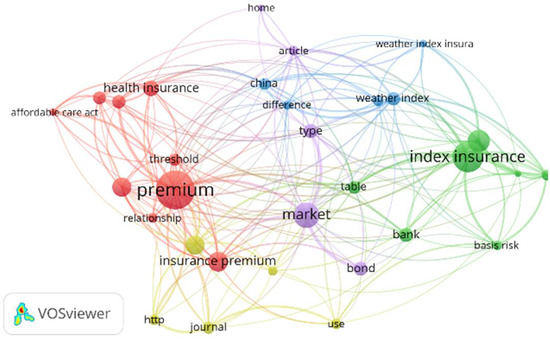 Visualization is used to see the network connections between items. Based on Figure 1, the results of the network visualization form four clusters, namely red, green, purple, and yellow, which are connected to each other. Each cluster consists of several items that are connected to each other. From Figure 1, there are two major parts that are not yet connected, namely the issue of premiums and index insurance, so there is an opportunity to examine the part that involves both of these things. The next step is to see the suitability between keywords based on the Vos Viewer plot.