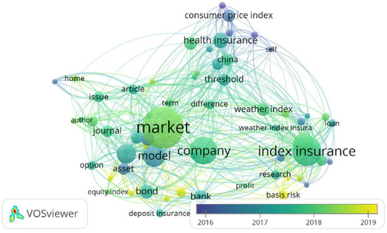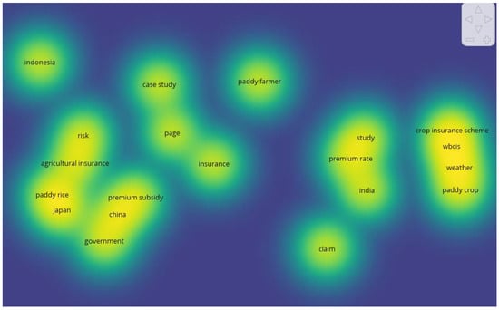 The density visualization map is used to see the depth of publication. In Figure 3 it can be seen that the lightest color indicates that a topic is widely used in research related to agricultural insurance, while the light color means that the topic is used less in research related to agricultural insurance. The agricultural insurance density visualization map is presented in Figure 3.
