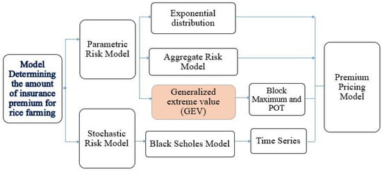 Based on Figure 4, it is implied that the method used in determining insurance premiums is divided into parametric risk models and stochastic models. The parametric model involves the exponential distribution and the distribution of extreme values, while the stochastic model generally adopts the Black Scholes model in its solution. On this occasion, we will try to develop a model related to weather index-based insurance.