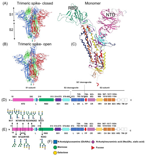 (A,B) Side view of SARS-CoV-2 spike protein trimer, open (PDB: 6VSB) and closed (PDB: 6VXX) configurations, respectively. Heptad repeats 2 (HR2), HR2 linker, transmembrane domain (TM), and cytoplasmic domain (CP) is omitted in the S2 subunit represented in A. (C) Spike protein monomer color-coded by subdomain. (D) Sequence of full-length spike protein with domain assignments, with N-terminal end to the left and C-terminal (stalk) end to the right. (E) N-linked glycans are shown, localized in the schematic representation by arrows, for the NTD and RBD domains only. (F) A key to the monosaccharides depicted in (E). C-E are from Aminpour et al., 2021 [3] (CC-BY 4.0); added glycan representations in E and the glycan key, F, are from Sikora et al., 2021 [106] (CC-BY 4.0).