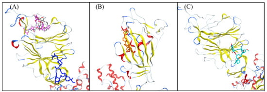 Binding poses of (A) ivermectin (dark blue), moxidectin (dark gray), doramectin (purple) on S1-NTD open conformation; (B) oleandrin (orange) on S1-RBD closed conformation; (C) selamectin (cyan) on S1-NTD closed conformation.