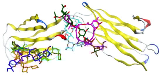 Binding poses of okadaic acid (green), doramectin (purple), selamectin (orange), P-57AS3 (dark green), concanamycin A (cyan) and ivermectin (dark blue) on CD147.