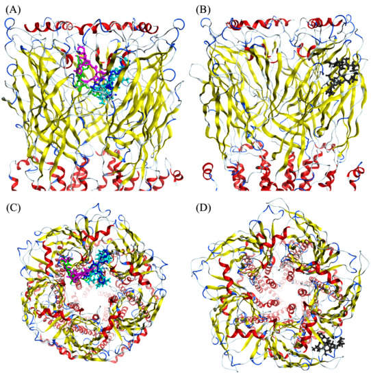 Binding poses of ivermectin (dark blue), doramectin (purple), okadaic acid (green), concanamycin A (cyan) on α7nAChr (A) side and (C) top view. Binding pose of moxidectin (dark gray) on (B) side and (D) top view.