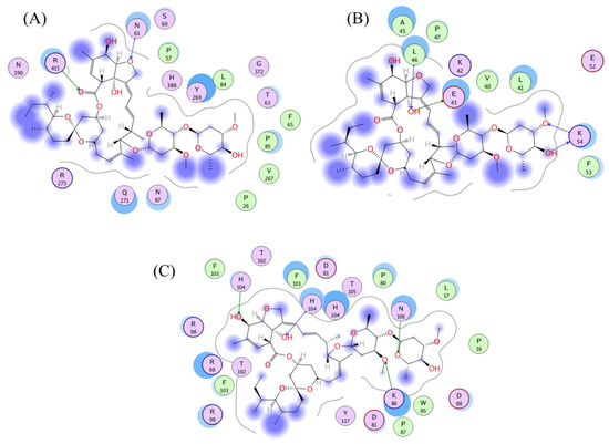 Ligand interaction plots of ivermectin for (A) spike, (B) CD147 and (C) α7nAChr inhibition.