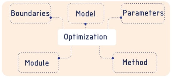 After the optimization task has been formed, it is necessary to determine the problem, the goal to be pursued by changing the specified variables. This goal is a form of objective functions. The identification of the most stable (or the most lightweight) structure is a natural task in shape optimization [25]. In the architectural and construction field, there are several limitations that need to be considered. The main idea is to vary a shape within a chosen class of domains, all satisfying certain industrial constraints (such as the quantity of material, spatial and dimensional restrictions, or some similarity to a fixed form), and to search for an optimal shape that minimizes a given target (energy) function [25]. All this forms the constraint space, which must be kept in mind since it restricts the search space to valid solutions. Subsequently, a suitable optimization method is selected, which provides an optimization of the objective function by varying the input parameters. Optimization methods can be applied to some different building design problems, such as massing, orientation, facade design, thermal comfort, daylighting, life cycle analysis, structural design analysis, energy and cost [8]. All the necessary optimization components are shown in Figure 1.