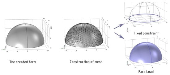 The shell is built within the Comsol program itself with an arbitrary radius of 10 m. To begin with, the input parameters or criteria are defined, such as the dome radius, R = 10 m, and vertical load, F = 30,000 N/m2. Finally, in the preparatory stage, a concrete material with a volume weight of 2300 kg/m3 is set for calculating the constructed form. Next, a computational grid triangular mesh is created and, to begin with, the finer element size is selected. As a result of the automatic mesh construction, 1406 triangles are obtained. The maximum element size is 1.1 m and the minimum element size is 0.08 m. The thickness of the shell is set at 0.1 m. Subsequently, a fixed constraint is installed along the entire lower ring and two face loads are set: the vertical load and dead load (Figure 3).