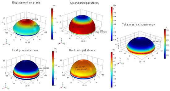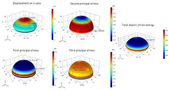 After setting all the necessary values, the shell is analyzed for the stress–strain state. On the z-axis, the maximum displacement value is 2.22 mm. The values of the first principal stress are −8.3 × 10−16 MPa (minimum) and 2.95 MPa (maximum). For the second principal stress, the minimum value is −1.88 MPa and the maximum value is 0.40 MPa. The values of the third principal stress are 4.7 × 10−16 MPa (maximum) and −5.85 MPa (minimum). The total elastic strain energy is 9020.16 J. Figure 4 represents a graphical diagram showing the maximum and minimum values.