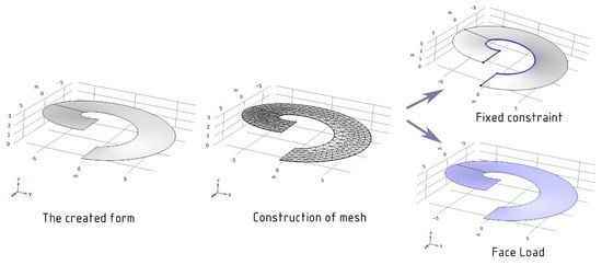 The helicoid shell is also built via Comsol using the following geometrical parameters: an inner radius of 3.1 m, outer radius of 7.1 m, and the height of one loop (3 m). Additionally, the vertical load F = 10,000 N/m2 and a dead load of the structure are set, and the concrete material has a volume weight of 2300 kg/m3. As a result of building an automatic mesh, a total of 572 elements is created with the maximum element size of 0.786 m and the minimum element size of 0.0572 m. The thickness of the shell is set to 0.16 m. The fixed constraint is installed on the initial, final, and internal faces of the structure (Figure 7).