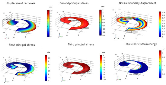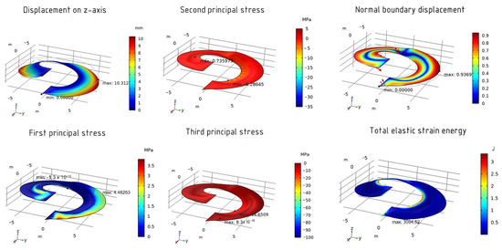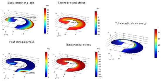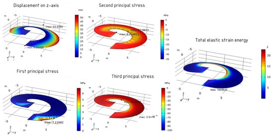 The maximum displacement value is 2.22 mm. The values of the first principal stress are −7.7 × 10−16 MPa (minimum) and 2.95 MPa (maximum). For the second principal stress, the minimum value is −1.88 MPa and the maximum value is 0.40 MPa. The values of the third principal stress are 4.3 × 10−10 MPa (maximum) and −5.8 × 10−16 MPa (minimum). The total elastic strain energy is 9020.16 J. Figure 6 represents a graphical diagram showing the maximum and minimum values.