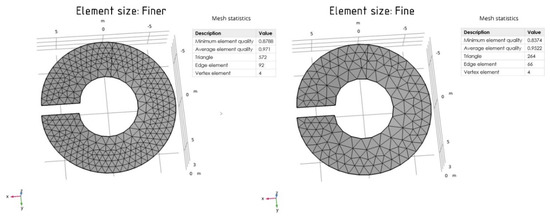 Next, the mesh type is changed from «fine» to «finer» (Figure 9) and the model is split into 264 triangles. The maximum element size is 1.14 m and the minimum element size is 0.143 m.