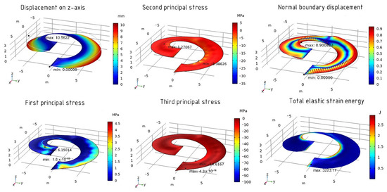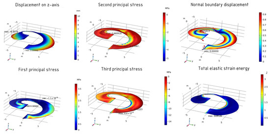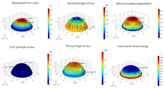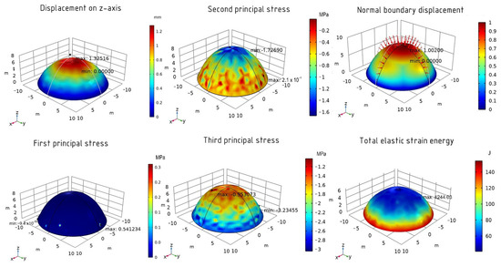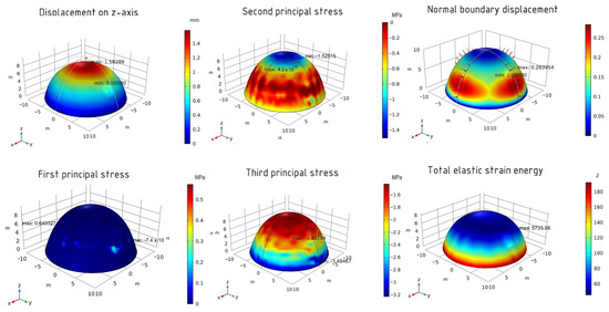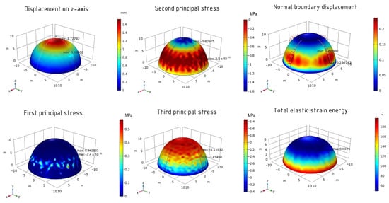 For the optimized shell on the z-axis, the maximum displacement value is 1.28 mm. The first principal stress has the following values: −7.8 × 10−16 MPa (minimum) and 0.45 MPa (maximum). For the second principal stress, the minimum value is −1.56 MPa and the maximum value is 4.45 MPa. The values of the third principal stress are −0.90 MPa (minimum) and −3.58 MPa (maximum). The normal boundary displacement is 76% and the total elastic energy is 4462 J. The results are shown in Figure 11.