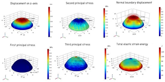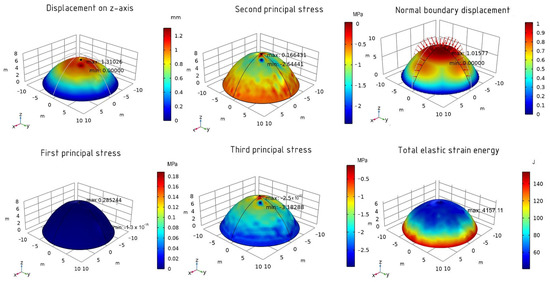 On the z-axis, the maximum displacement value is 1.16 mm. The first principal stress has the following values: 1.38 MPa (maximum) and −1.1 × 10−15 MPa (minimum). For the second principal stress, the maximum value is 1.07 MPa and the minimum value is −1.57 MPa. The values of the third principal stress are 5.1 × 10−17 MPa (maximum) and −2.81 MPa (minimum). The normal boundary displacement for the optimized shell is 107% and the total elastic energy is 4157 J. The results are shown in Figure 12.