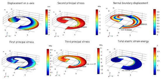 When calculating 1 loop of the helicoid, the maximum movement along the z-axis is 10.3 mm. As for the stress–strain state, for example, in the MMA method, the maximum and minimum first stresses are 4.39 MPa and −1.1 × 10−15 MPa, respectively, the second 0.66 MPa and −6.53 MPa, and the third 6.6 × 10−16 MPa and −15.21 MPa. The normal boundary displacement is 94% and the total elastic energy is 3096.29 J (Figure 17).