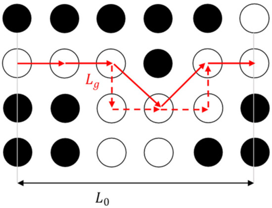 In Equation (1), as in Figure 1, L0 is the shortest route length of the analyzed material (commonly the length of the straight-line size domain), and Lg is the mean of the effective routes’ length obtained by considering the void spaces in the material.