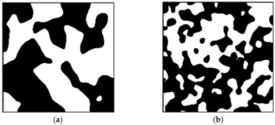 This procedure is relevant since it guarantees the application of the pathfinding algorithm. The porous media creation starts with a matrix image of random noise generated with zeroes and ones. Then, a multidimensional Gaussian filter is applied. It is implemented as a sequence of one-dimensional Gaussian filters with a kernel of sigma equal to the mean of the image’s size divided by 40 times a correction parameter named blobbiness. The sigma formulation is intended to allow images with visually acceptable solid and porous space distribution at low blobbiness values [26]. The blobbiness is the variable that controls the morphology of the porous media and falls in the 0 to 1 range. By reducing its value, larger pore diameters in the final structure are expected. Figure 2 shows a comparison between two two-dimensional porous media with different blobbiness values where the black color represents solids and white means void spaces. In the current study, the blobbiness value is established as a constant and is equal to 0.5.