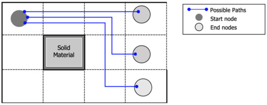 To find the geometric tortuosity of a porous medium, all the possible paths based on the arrival nodes are evaluated, as depicted in Figure 5. Computing the geometric tortuosity requires finding a minimum value for all the possible paths that originated from a starting point. The evaluation was carried out on each starting node, and the computation was carried out by using Equation (7):