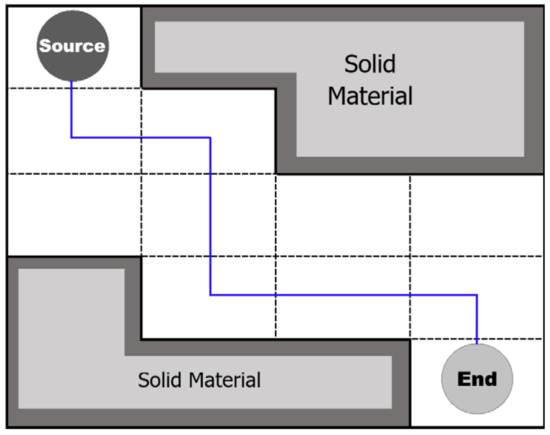 Since it is necessary to search paths, it could be treated as a pathfinding problem. Several algorithms have been used to solve the required task in previous studies. In the current study, the A-star algorithm is employed. It is not the best path-search algorithm, because other methods can preprocess the map to guarantee more efficiency. Two of them are contraction hierarchies [10,11] and transit routes [12]. However, studies have declared that the A-star is a powerful tool and a well-known best-first search algorithm due to its wide application range in solving problems [13,14]. Other algorithms have been used extensively to compute geometric tortuosities, such as the direct shortest-path search [15], the skeleton shortest path [16], fast marching [17], the Dijkstra algorithm [18], and the pore centroid [19].