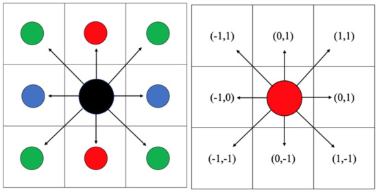 Since the materials in this study are porous media and search-path-finding is a requirement, it was necessary to define an entry and endpoint (inlet and outlet boundaries). The entry and endpoints define the different paths followed through the domain’s void spaces. The referred paths are seen as species that can flow through the material. To determine the nodes occupied during the species’ movement, a free displacement in the four cardinal positions is considered, i.e., up, down, left, and right, as well as the ordinal positions shown in Figure 7. The simulated streamlines can flow from the inlet to the outlet. Hence, it avoids obstacles until reaching the end of the material and produces effective routes.