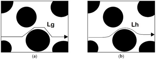 Geometric tortuosity: The geometric tortuosity depends on the solid material’s distribution within the domain. It can be determined as the ratio between the average length of the followed geometric paths to the straight path across an analyzed domain (side length). The geometric paths found in porous media do not follow the exact contour of solid particles. The geometric paths follow a consecutive connection of void nodes restricted to small straight lines, as shown for Lg in Figure 8a.